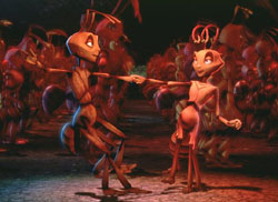 It's also an amazing feat of computer animation, so advanced and life-like it almost makes "Toy Story" look like it was made by a kid with a box of 64 Crayolas. The smallest change in facial register on Z's face conveys almost as much as a human face could. According to the press kit, the animators developed new technology that allows for 300 seperate control elements (muscles, eyes, etc.) in the character's faces. All I can say is, I'm very impressed.