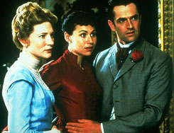 The film opens with the curtains drawing back on the bed of resolute bachelor Lord Goring (Rupert Everett), who is saying goodbye to a pretty overnight guest. Just to look at Everett in this role is to realize that he is the most consummate Oscar Wilde performer ever. Charming, aristocratic, handsome, smug, sharp-tongued but distinguished, he sets the tone for his character's views toward society, and especially toward marriage, in this first scene, saying, his voice dripping with irony, "Other people are quite dreadful. To love oneself is the beginning of a lifelong romance."